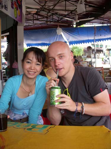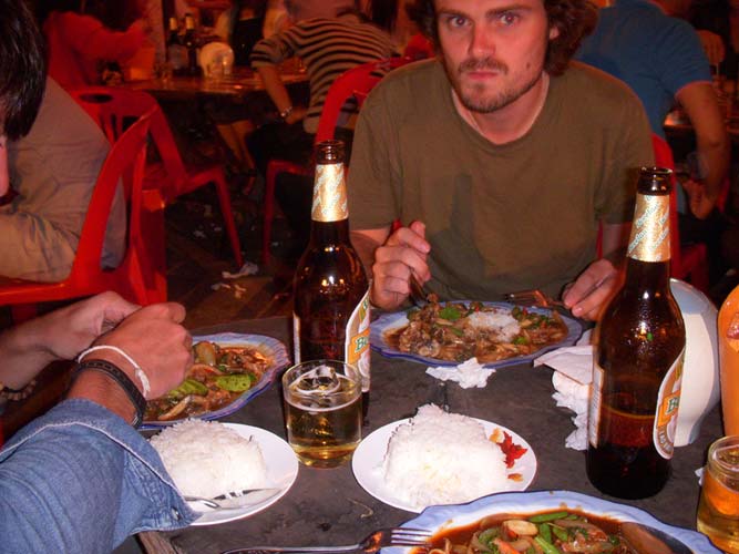 We grabbed a well deserved beer and then headed out for some food. We stumbled across a local restaurant near a bus station that was full of Laos people around our age. We sat down as the only white people in there and got stared at quite a bit! The menu was a little different to most places we had eat at, offering Cricket Fried Rice or Eels with Chili… hmmm, maybe next time! Jase and Ed had frog, I had Squid with Shrimp. They both came out in the same sauce which was good, but so hot I could not taste anything by the 3rd mouthful! A Cornetto on the way home took the sting out of it!