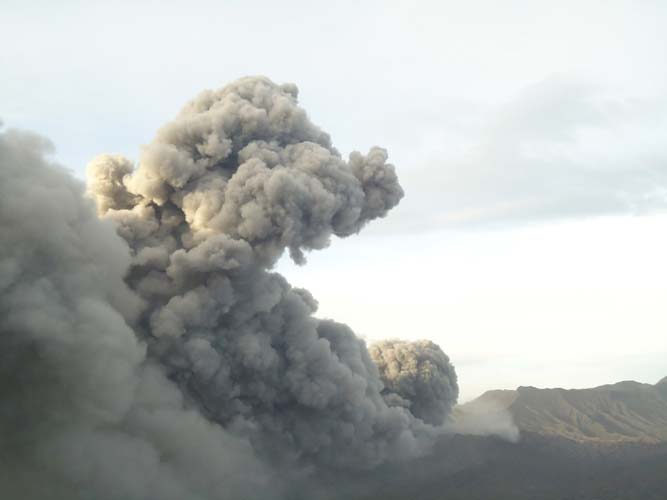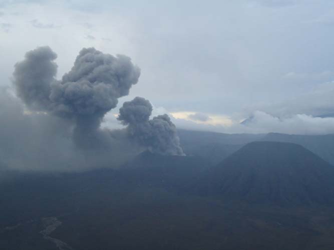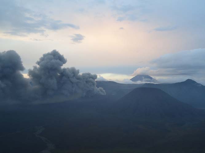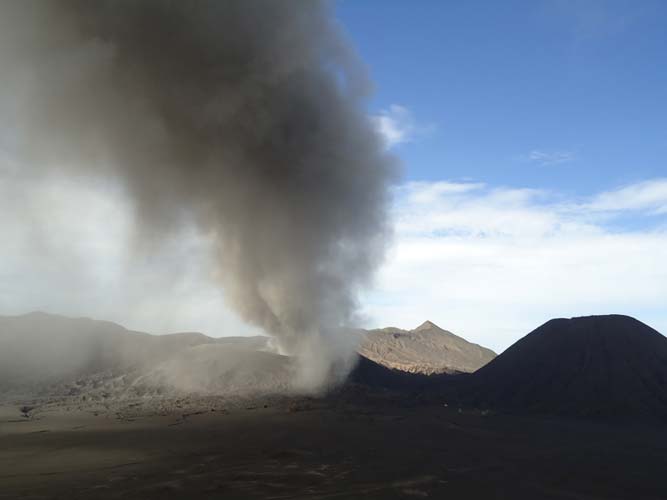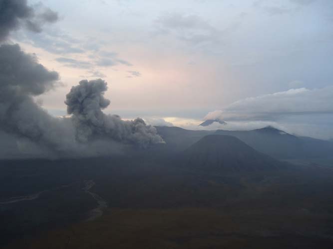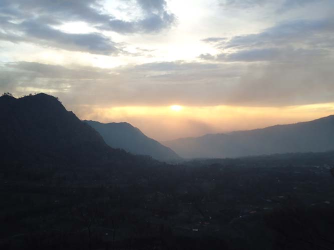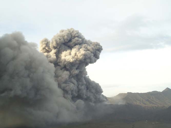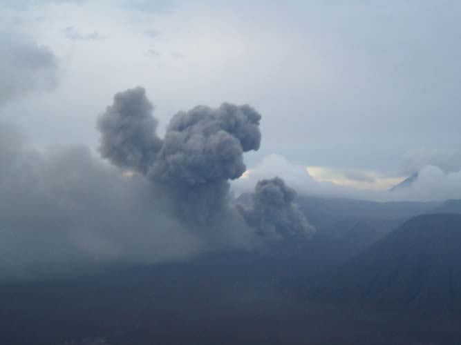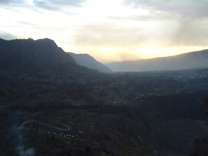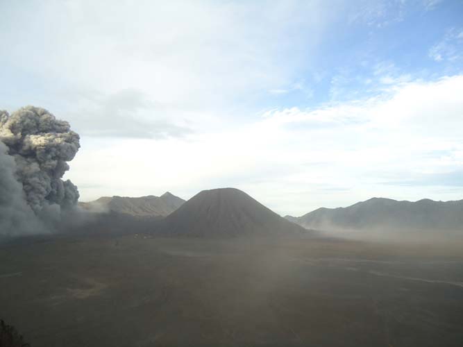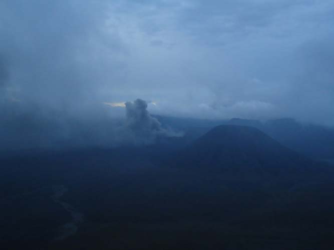 Up at 3:45AM and into the van to go to the lookout point. As we walked up towards the lookout we all stopped and stared in awe. Bromo was throwing molten hot magma out the top and we watched it dance out the top, oranges and reds on a perfectly black background. WOW! We carried on to the top and visibility decreased until the sun came roaring up. The landscape was revealed and we could see and hear Bromo still giving it everything. The mushroom clouds coming from the crater were enormous! Hundreds of feet in the air, the wind carrying them away. We headed back and walked to the top of our street and were head on for the ash cloud. We could see now why everything was ash covered. Fields, trees, houses, cars and the street all black from ash. It cant be good for anyone living there!