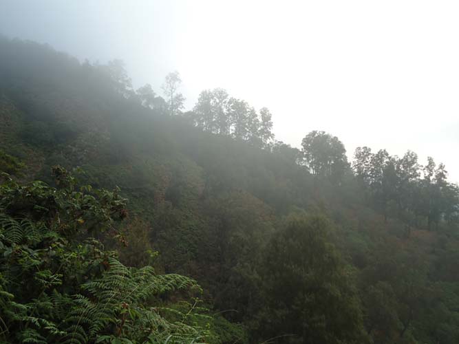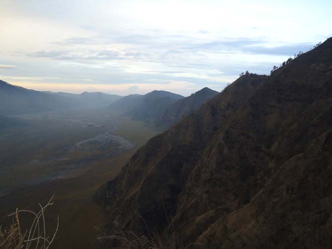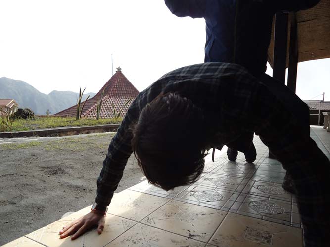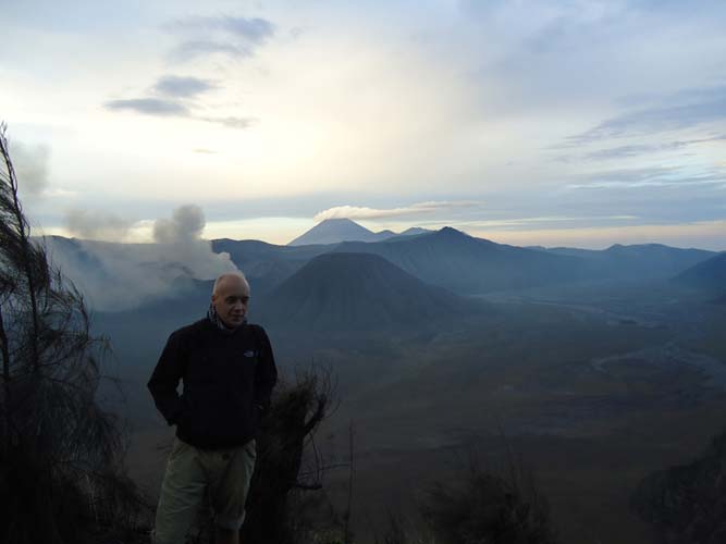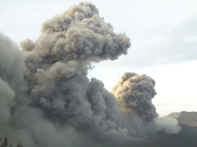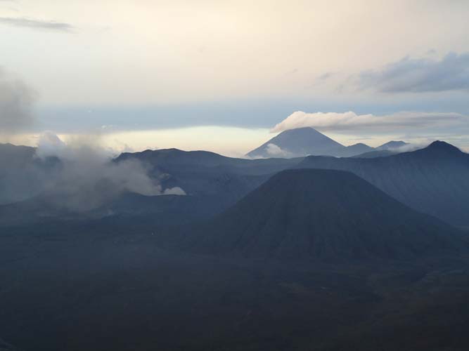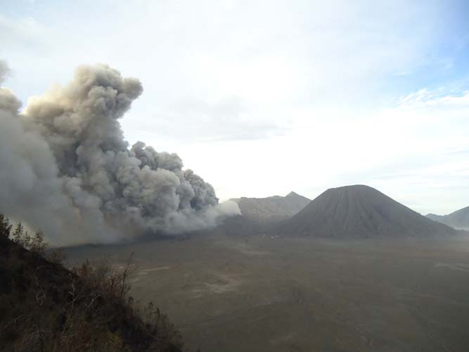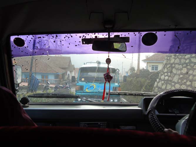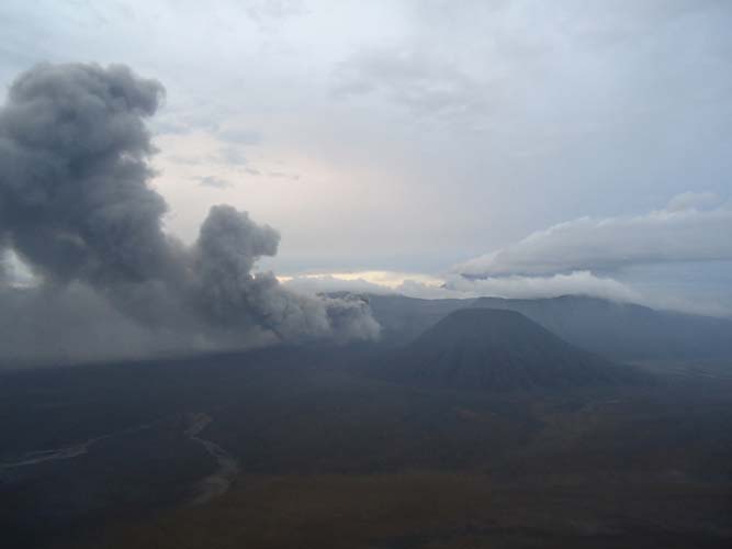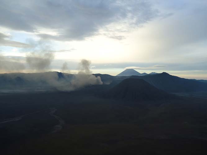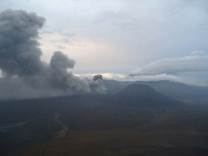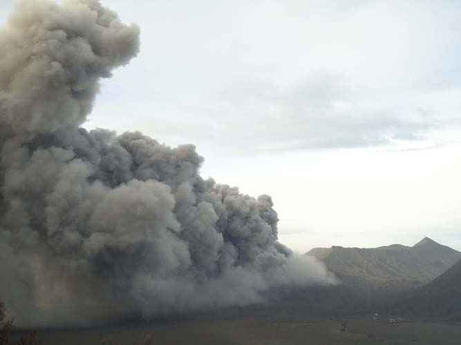 Up at 3:45AM and into the van to go to the lookout point. As we walked up towards the lookout we all stopped and stared in awe. Bromo was throwing molten hot magma out the top and we watched it dance out the top, oranges and reds on a perfectly black background. WOW! We carried on to the top and visibility decreased until the sun came roaring up. The landscape was revealed and we could see and hear Bromo still giving it everything. The mushroom clouds coming from the crater were enormous! Hundreds of feet in the air, the wind carrying them away. We headed back and walked to the top of our street and were head on for the ash cloud. We could see now why everything was ash covered. Fields, trees, houses, cars and the street all black from ash. It cant be good for anyone living there!