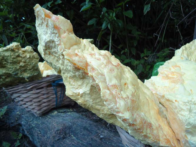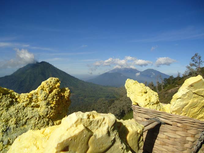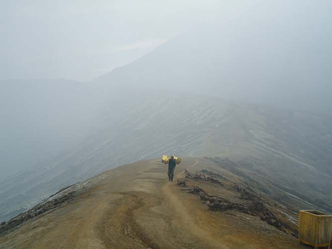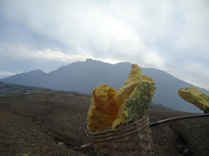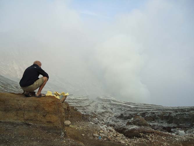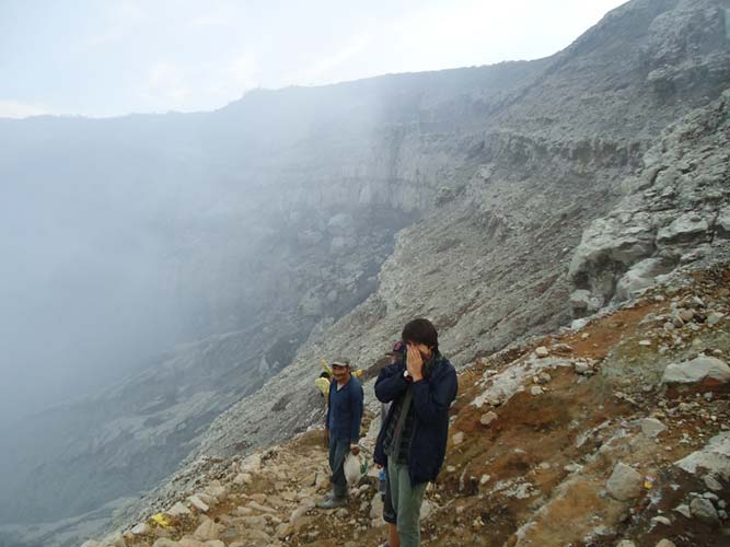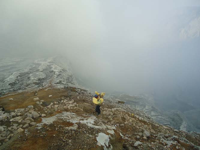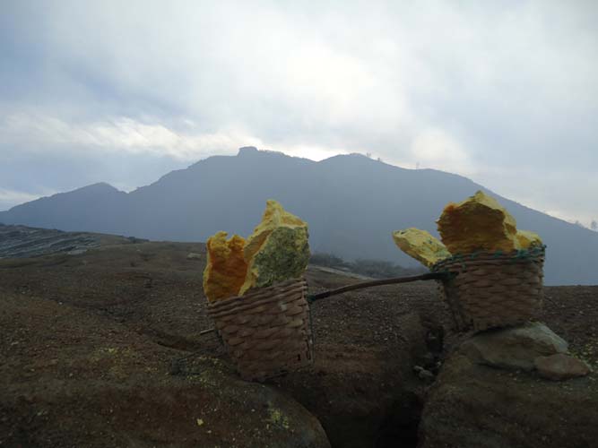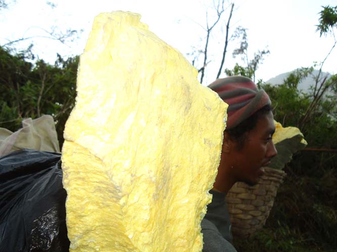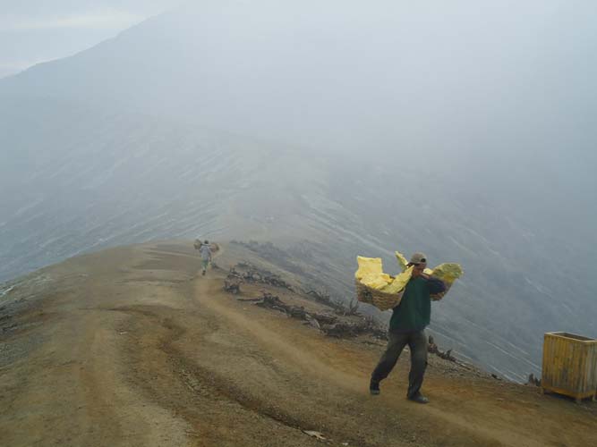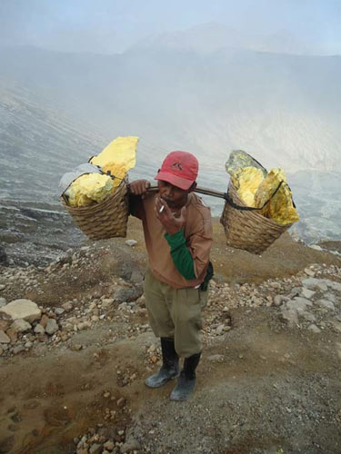 It is the job of hundreds of miners to get this poisonous sulfur out from the bottom of the crater, to the top, and then the next 3KM down the other side to the bottom. This might not seem to bad when you hear they only do 2 runs a day. But then again they are carrying 90-100KG in weight on their shoulders each and every time. We all tried to lift an unattended basket, none of us could pick it of the floor. Add this to the fact that its poisonous and it knocks years off their lives doing it and its no wonder why the BBC recently ran an article on it being the most dangerous job in the world!
