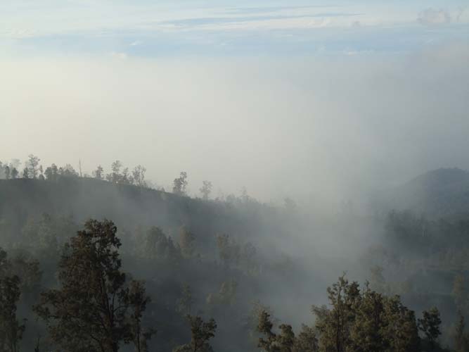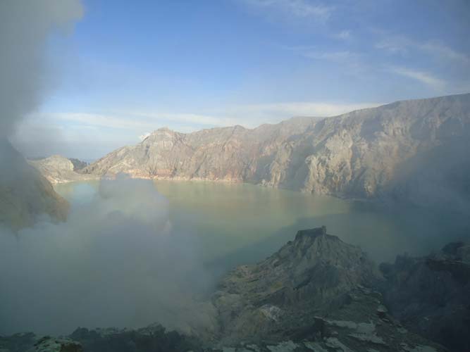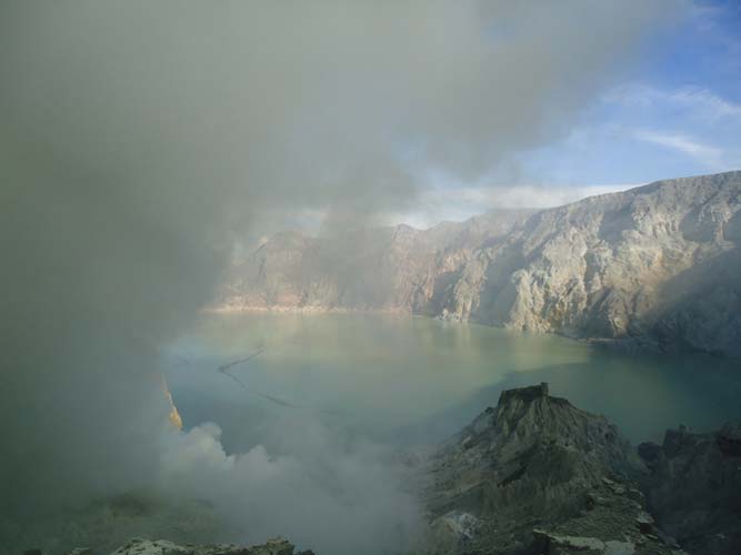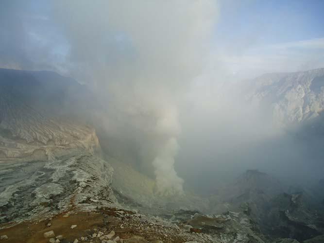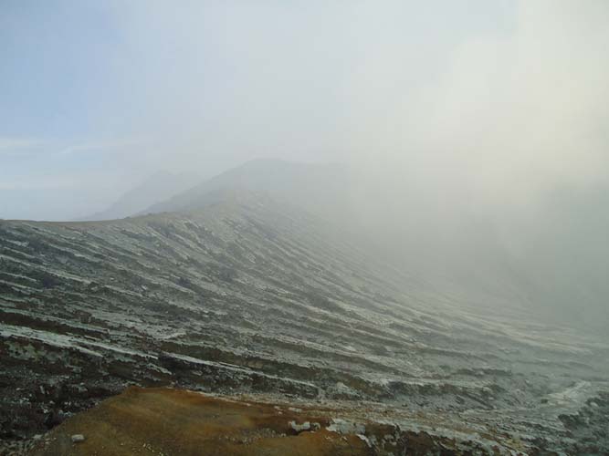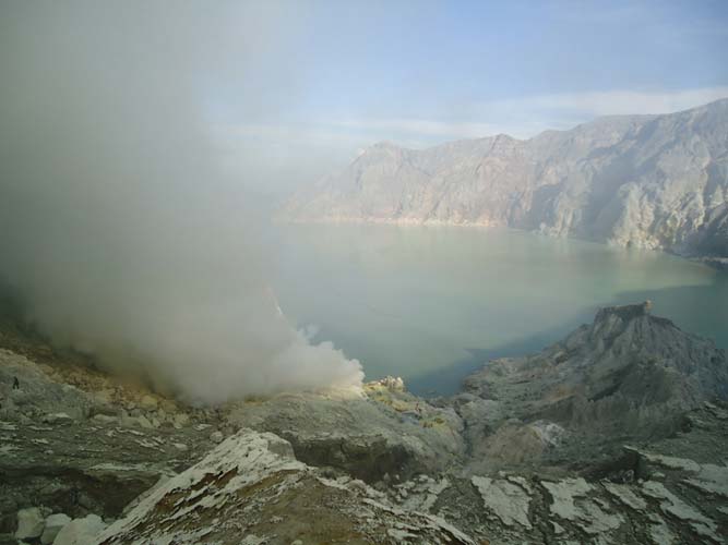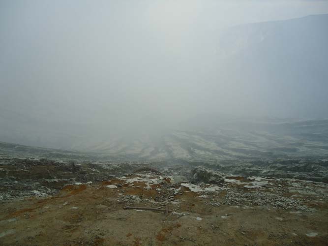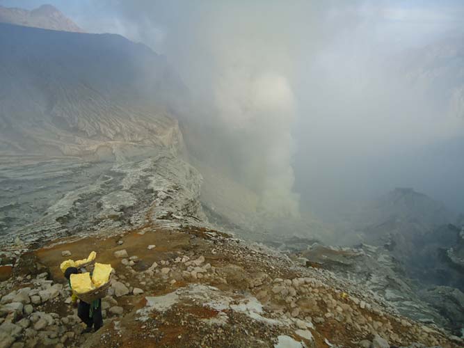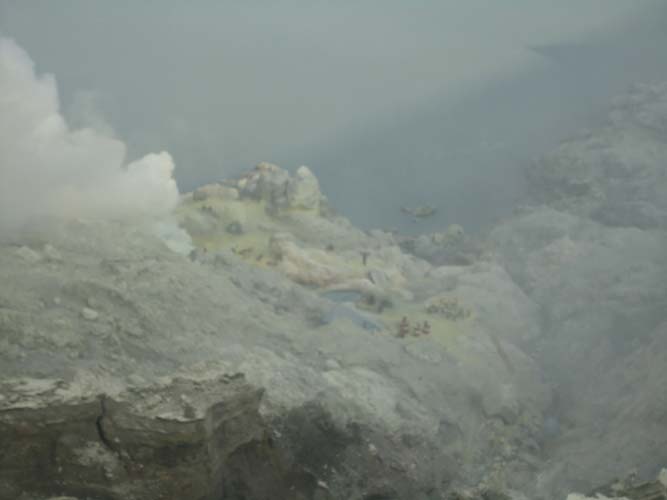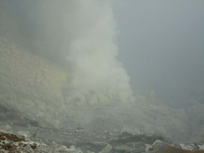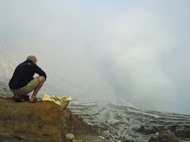 Up again at 3:45AM and into the van to the base of Ijen. It was 3KM to the crater, nothing compared to Merapi. But the fumes coming off made it hard to breath. Ijen is an active volcano producing sulfur. It spews out yellow smoke and over time it drops, hardens and becomes solid rock to be mined and sold.