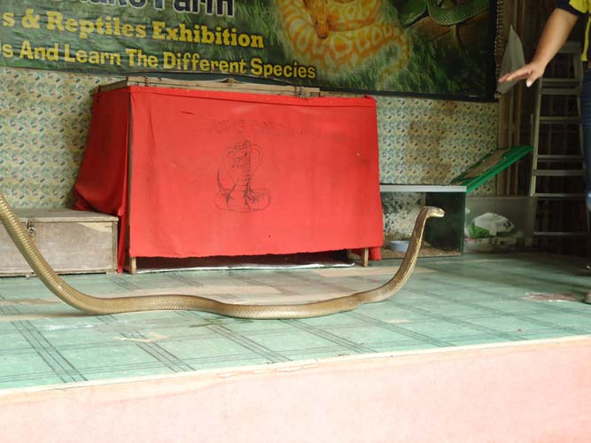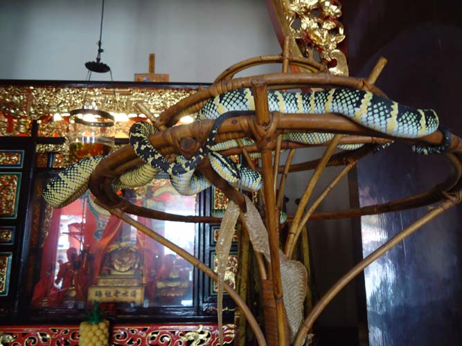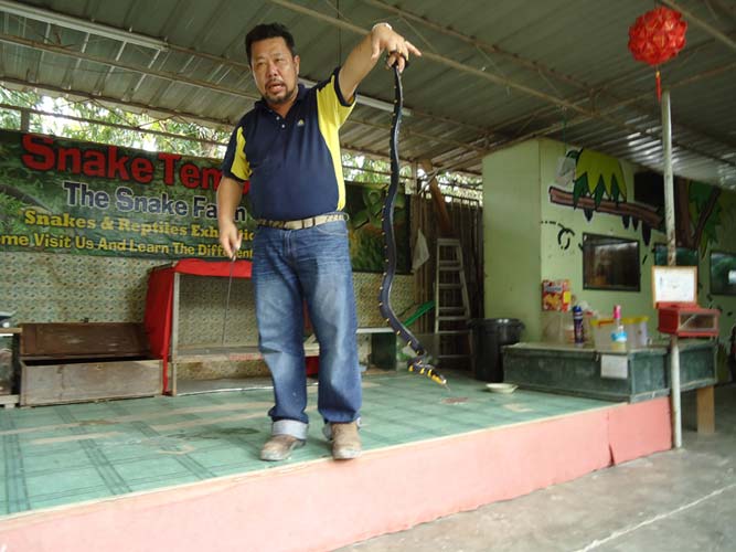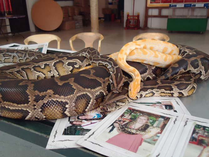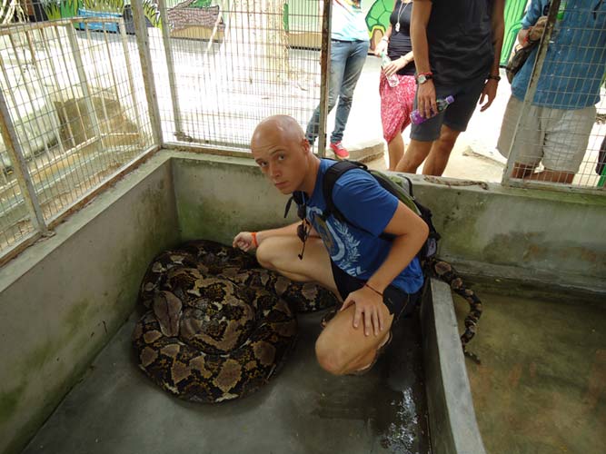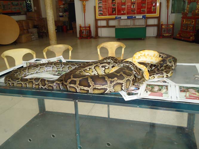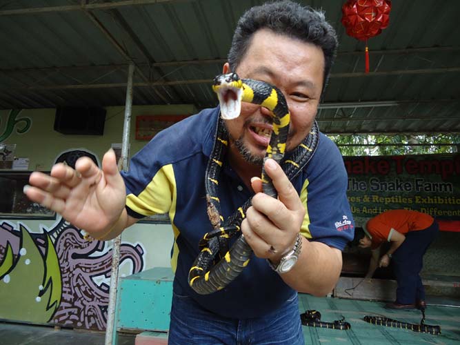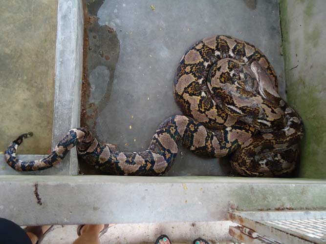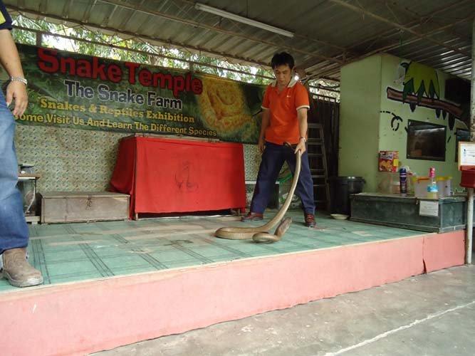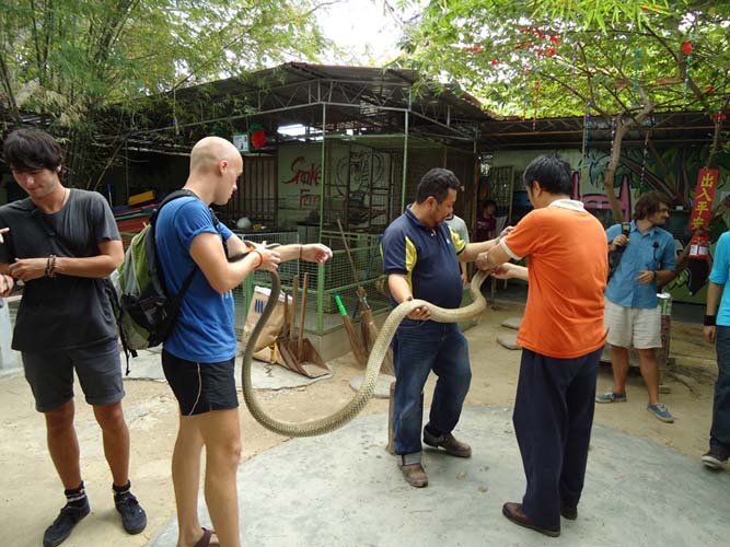 We rented motorbikes the following day to explore Penang. After being shown around a Hindu temple we went to a ‘Snake Temple’ a hundred meters down the road. There were live snakes in the temple, billed as ‘Temple Vipers’ (Sumatran Viper). After a look around the temple we decided to go the the snake farm next door. With everyone’s memorable crocodile affair they weren’t too keen on another ‘farm’ but we all agreed that this one had to be better. It did not disappoint…