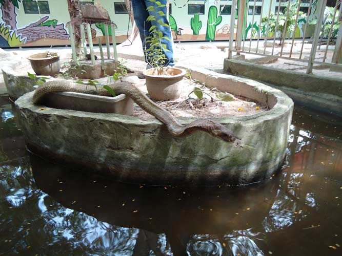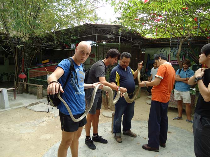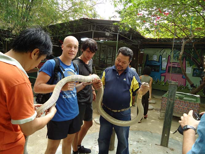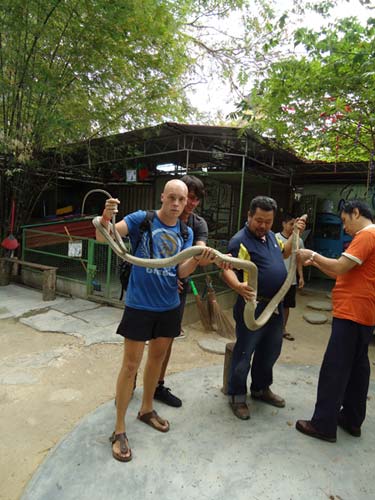 After seeing a lot of snakes in vivariums (not forgetting the monkey giving Brogan attitude!) we came across a Cobra that only had a moat of water around it, and with an animal that’s a pretty strong swimmer and climber was utterly pointless. It could roam where it wanted! After a few pics the snake disappeared and we were suddenly in front o the largest venomous snake in the world, the King Cobra! This thing was easily 12ft long and could move very quickly. The other Cobra had been removed as the King would of eat it given the chance! After it made its way where ever it wanted and confronting me it was caught by the handler and we held the King and helped to shed its skin! Being a snake geek I was ecstatic and loved every minute. The King was put back and we continued round looking at more exotic and deadly snakes.