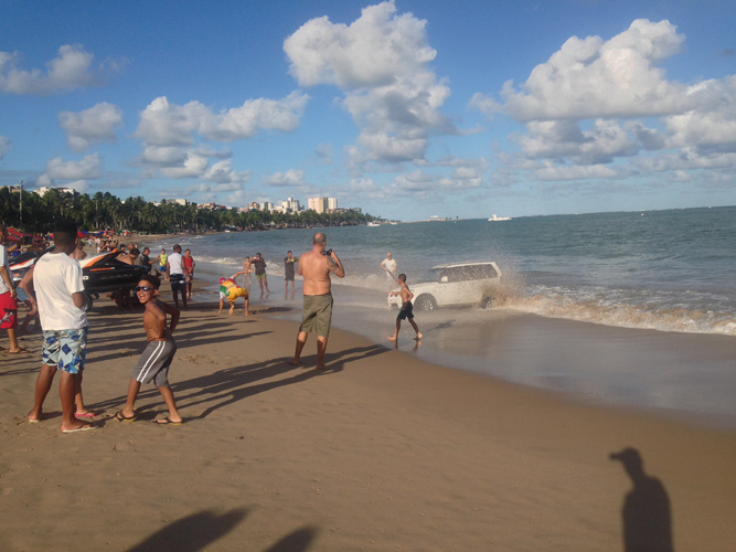 One great thing did happen though when I had a stroll to the beach and have a beer. I saw a big crowd of people gathered round the edge of the sea. As I got a little closer I could see a 4×4 had got stuck in the sand and with the waves now over the tyres it was a race against the tide to get it out.
