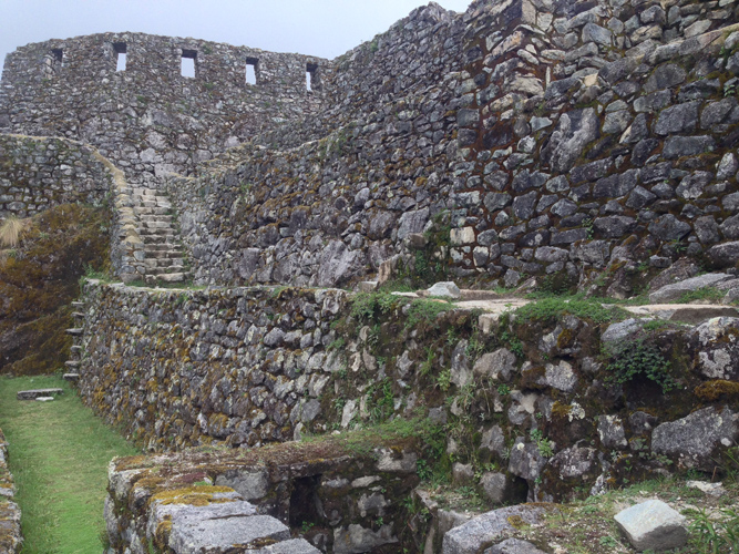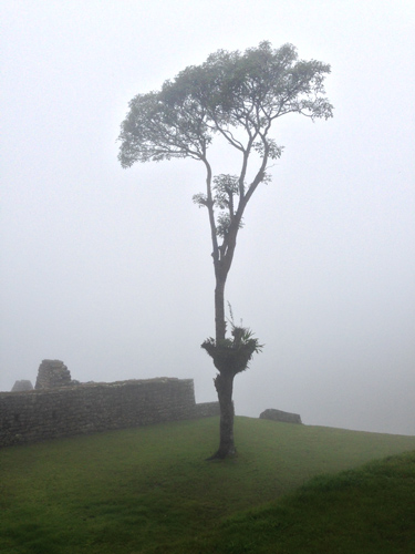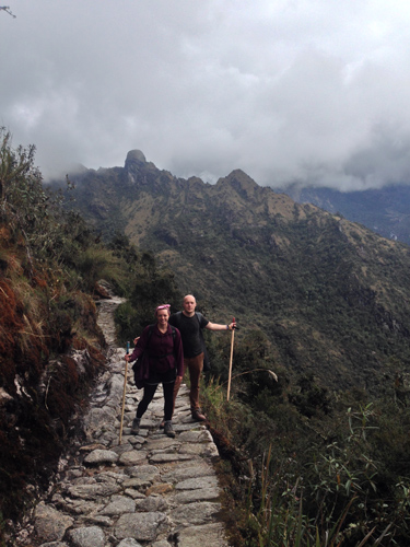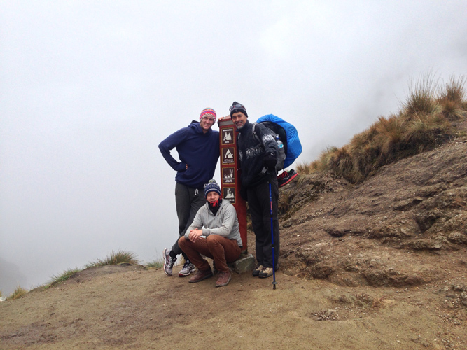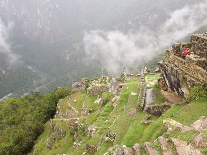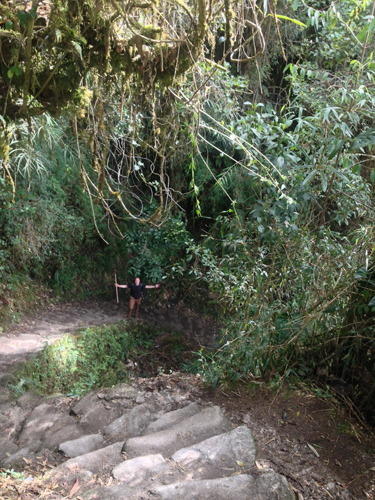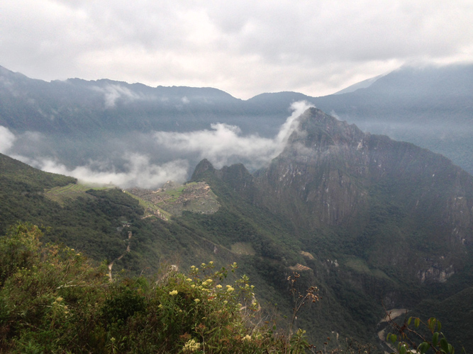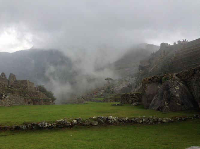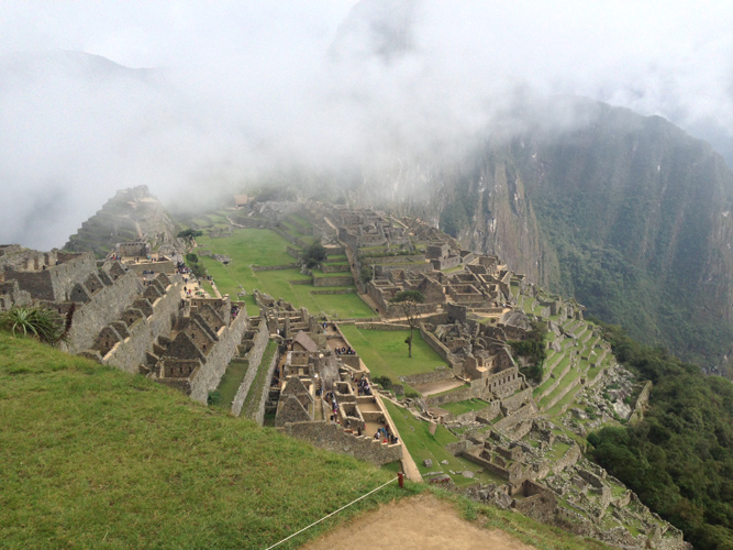 It was a 2 hour hike on Inca flats again but we knew the pace had to be quick to get to the Sun Gate for sunrise. We made it to the Sun Gate after a tricky 20 meter up section that was the hardest on the trail yet, it was almost vertical with huge stones as the steps. We got our first glimpse of Machu Picchu through the clouds but no one cared, we had made it to the sacred ground. One couple, who had struggled a little whilst on the trail, got to the Sun Gate about 10 minutes after most and burst into tears at the top. We all got a little emotional.